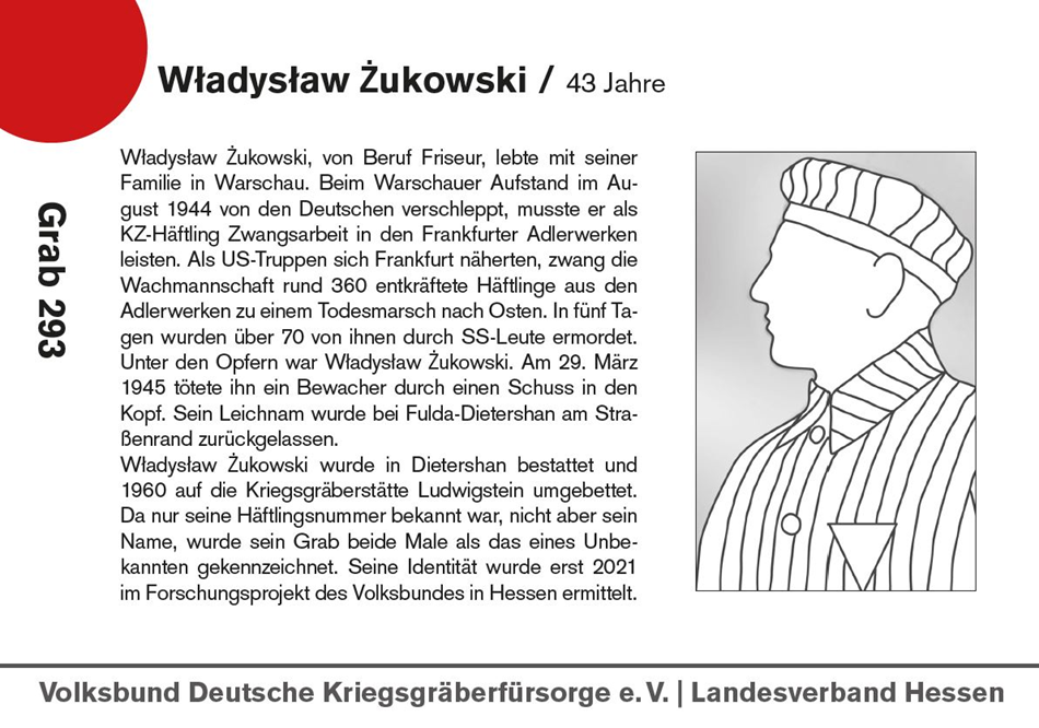 „Ich gehe davon aus, dass der Tote von Dietershan Władysław Żukowski hieß. Dieser war am 27. Juni 1901 in Warschau geboren und lebte mit seiner Frau Helena (geb. 1909) und seinem Sohn Aleksander (geb. 1932) in der ulica Tamka (‚Tamka-Straße‘) 45a in der Warschauer Innenstadt. Bei der Niederschlagung des Warschauer Aufstands wurde er im August 1944, als deutsche Truppen das Gebiet um die Tamka-Straße von der polnischen Heimatarmee zurückeroberten, gefangen genommen. Zunächst in das Durchgangslager 121 Pruszków bei Warschau verschleppt, gelangte er von dort am 12. September 1944 mit einem Transport von 3.042 polnischen Männern in das KZ Dachau, wo er als Häftling mit der Nummer 107.656 registriert wurde. Als Beruf wurde in die Häftlings-Karteikarte ‚Friseur‘ eingetragen. Nach einer Selektion durch den Arbeitseinsatzingenieur der Frankfurter Adlerwerke wurden 1.000 Männer des Transports vom 12. September schon zwei Wochen später in das Frankfurter Außenlager des KZ Natzweiler ‚abgegeben‘. Der Transport traf am 29. September 1944 in den Adlerwerken ein, wo die Häftlinge im Nummernsystem von Natzweiler noch einmal neu registriert wurden. Unter ihnen war Władysław Żukowski, dem nunmehr die fünfstellige Nummer 37.582 zugewiesen wurde. Władysław Żukowski überlebte die Monate der Zwangsarbeit in den Adlerwerken und war unter den etwa 360 –370 Gefangenen, die am Abend des 24. März 1945, als US-Truppen sich Frankfurt näherten, von der Wachmannschaft nach Osten in Marsch gesetzt wurden. Nach vier Marschtagen bzw. -nächten verbrachten die Männer, die zu diesem Zeitpunkt noch lebten, am 28. März die nächtliche Rast zum ersten Mal nicht unter freiem Himmel, sondern in einer Scheune am nördlichen Stadtrand von Fulda. Geht man davon aus, dass der Tote von Dietershan mit Władysław Żukowski identisch war, so befand sich dieser noch am Leben, als sich die Kolonne am Morgen des 29. März auf der Reichsstraße 27 (heute B 27) wieder in Bewegung setzte. Auch im Verlauf dieses letzten Marschtages, bevor die Häftlinge bei Hünfeld in einen Güterzug ‚verladen‘ wurden, der sie ins KZ Buchenwald brachte, verübten die Bewacher wieder Morde an entkräfteten Gefangenen. Einer von diesen wurde auf der Höhe von Dietershan, an dem die Reichsstraße in kurzer Distanz vorbeiführte, durch einen Schuss in den Kopf getötet. Sein Leichnam wurde zurückgelassen. Drei Tage später erreichten US-Truppen die umliegenden Ortschaften. (Hartmann, Mail „KGS Ludwigstein, Einzelschicksal W. Żukowski“)