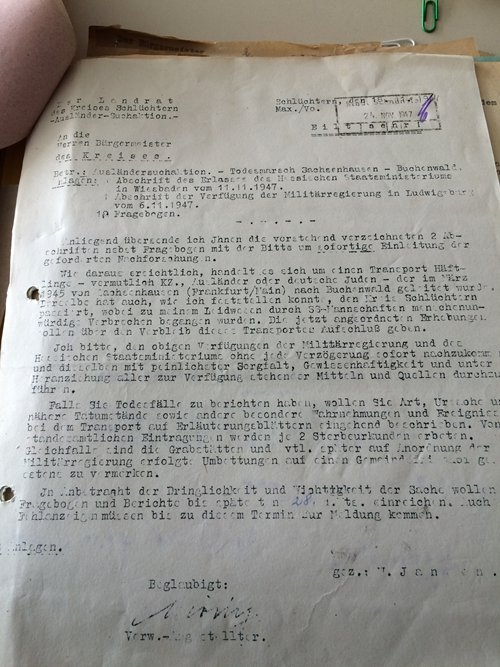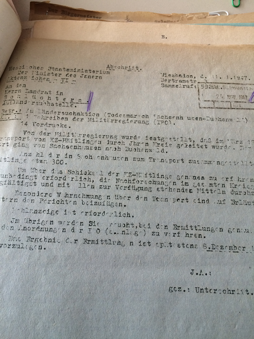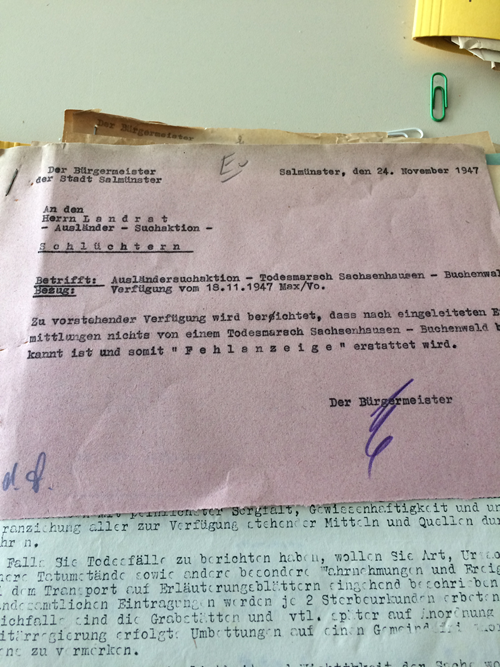 „Da ist zunächst der Bericht des Landrats von Gelnhausen vom Ende des Jahres 1947, der auf Aufforderung des Hessischen Innenministers Nachforschungen über Opfer des oben vorgestellten Todesmarsches anzustellen und diese dem Innenministerium zu melden hatte. In seinem Bericht kommt Landrat Kreß zu dem Ergebnis, dass diese Nachforschungen trotz intensiver Bemühungen ‚erfolglos‘ verlaufen sind. Das heißt, die Mitarbeiter des Landratsamtes konnten im gesamten Landkreis Gelnhausen keinen Toten entdecken, der diesem Todesmarsch zuzuordnen wäre. Nach Aussagen eines deutschen Teilnehmers des Todesmarsches (Gottlieb Sturm) wurden bei Gelnhausen jedoch jüdische KZ-Häftlinge erschossen: ‚Hinter Gelnhausen wurden weitere Erschießungen vorgenommen. Ich sah dort, daß man die Juden in unserem Zuge, es waren 24 Mann, auf die Wiese trieb und dann abschoß. Nur einer davon hat Buchenwald lebend erreicht‘. Meine These lautet: Mit dem überlegten und koordinierten Verschweigen der Spuren und der Opfer des Todesmarsches im Landkreis Gelnhausen soll eine mögliche Folgeuntersuchung vermieden werden. Diese hätte wahrscheinlich nicht nur den sozialen Frieden in Frage gestellt, sondern auch in den Augen der Akteure auf dem Landratsamt dem Ruf der Kreisstadt geschadet.“ (Coy, Ein Bericht aus dem Jahr 1947)